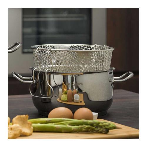 La pentola per friggere della Linea Vanitosa, ha un corpo in acciaio inox 18/10 per prestazioni elevate, presenta un fondo multistrato termoradiante acciaio/alluminio/acciaio ed è dotata di 2 manici in acciaio inox che garantiscono una presa salda e sicura. Il set è composto da un corpo per friggere, un cestello da fritto e un coperchio.