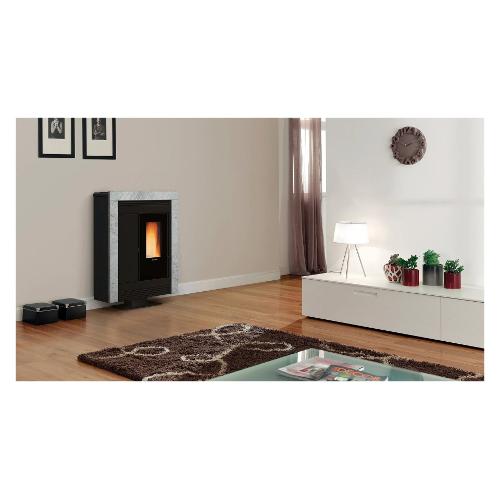Stufa a pellet dal design compatto, ideale per spazi ristretti. Si adatta perfettamente a diverse esigenze d'installazione grazie alle molteplici opzioni per l'uscita della canalizzazione e dello scarico fumi. Ventilazione gestibile scegliendo tre diverse intensità e canalizzazione raggiunge 6 metri di distanza.