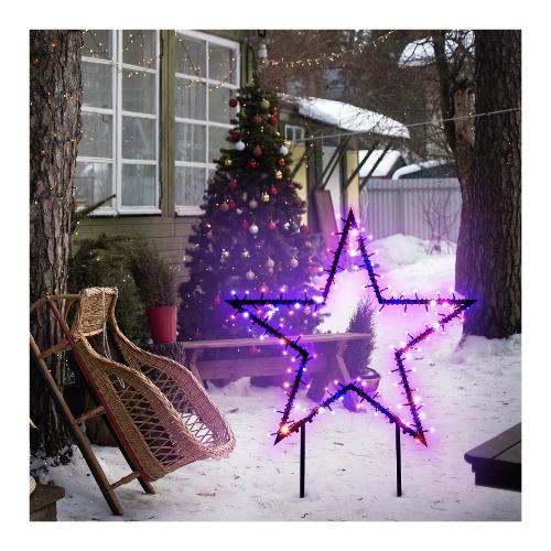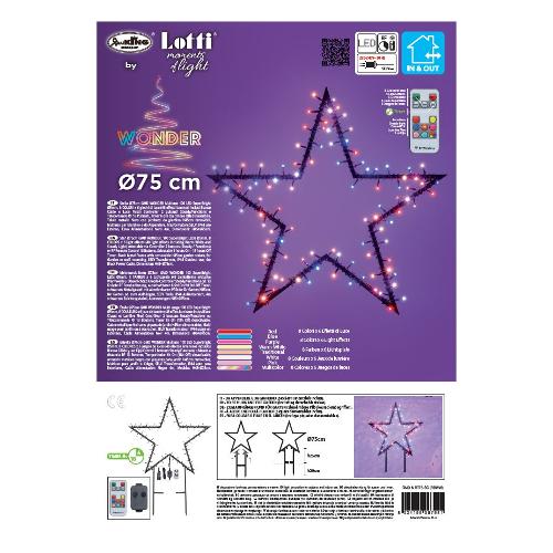 Stella ø75cm GMD WONDER Multiuso 100 LED SuperBright ø5mm, 8 COLORI x 6 giochi di luce (48 effetti luminosi inclusi Bianco Caldo e Luce Fissa) Controller 2 pulsanti Steady/Functions o Telecomando RF 13 Pulsanti, Timer 6 ore On (18 ore Off) disinseribile, Telaio metallo Nero con picchetti da giardino H45cm removibili, Multiuso per Giardino o da Appendere, Trasformatore, IP44 uso Esterno, Cavo Alim. Nero 4m, Dim. H45+ø75cm