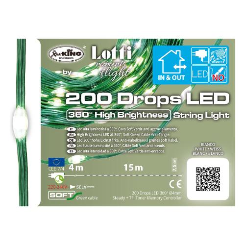 Catena lineare 15m mtl 200 gocce di luce led 360° bianco ø4mm, led high brightness alta luminosità a 360° , memory controller luce fissa + 7 giochi luce selezionabili con timer 8 ore on 16 ore off disinseribile tramite pulsante luminoso integrato nel trasformatore bassa tensione di sicurezza, ip44 uso esterno e interno