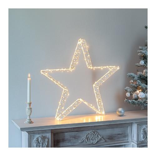 Stella wsh 3d edge ø37cm 240 microled bianco caldo ø1,5mm, serie plm con cavo argento silver metal pro, telaio metallo verniciato bianco, gioco di luce automatico flashled diamond (led luce fissa + led con lampeggio lento), timer giornaliero 8 ore on disinseribile tramite pulsante luminoso integrato nel trasformatore selv di sicurezza, ip44 uso esterno e interno, cavo alimentazione trasparente 4m