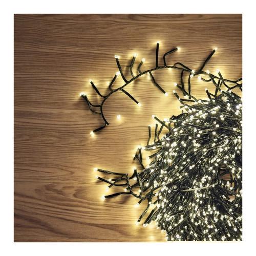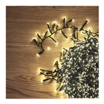 Catena festone minicluster plus ø10cm fntl 30m 1500 miniled bianco caldo ø3mm, cavo verde, timer memory controller luce fissa + 7 giochi di luce selezionabili con timer 8 ore on (16 ore off) disinseribile tramite pulsante luminoso integrato nel trasformatore selv di sicurezza, ip44 uso esterno e interno