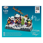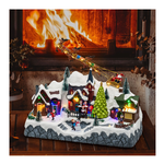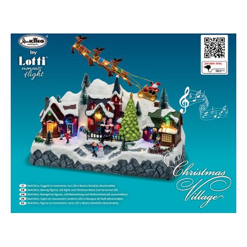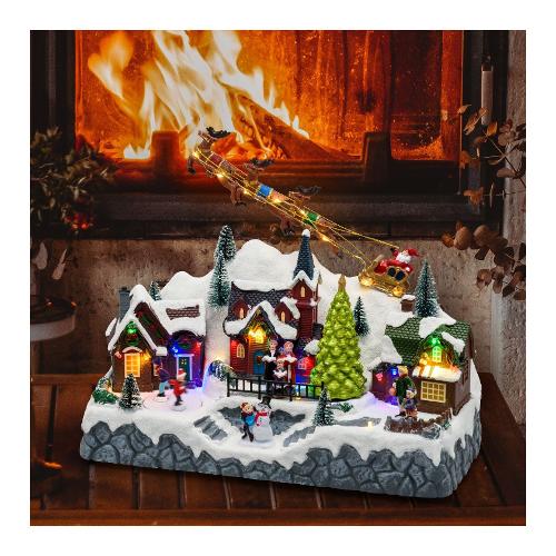 Paesaggio innevato con albero natale e pattinatori in movimento (rotanti), babbo natale su slitta volante, illuminazione con giochi di luce led color, musica natalizia (8 motivi ripetuti in sequenza) disattivabile con interruttore on1 (con musica) - off - on2 (senza musica), trasformatore incluso, ip20 uso interno,