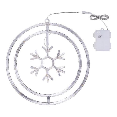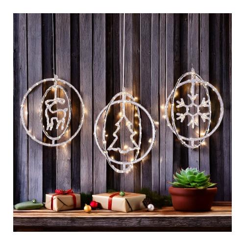 Decorazione Natalizia ø32cm in plastica Crystal Mix3 soggetti interni Stella / Fiocco / Albero, illuminata da MicroLED BIANCO CALDO a Luce Fissa, Timer Giornaliero 8 ore On (16 ore Off), porta batterie IP44 con pulsante 3 funzioni Timer - On - Off, a Batteria 3xAA 1,5V, IP20 uso Interno e Portatile, Cavo Alimentazione Trasparente 100cm con Gancio regolabile per appendere incluso