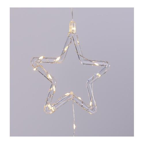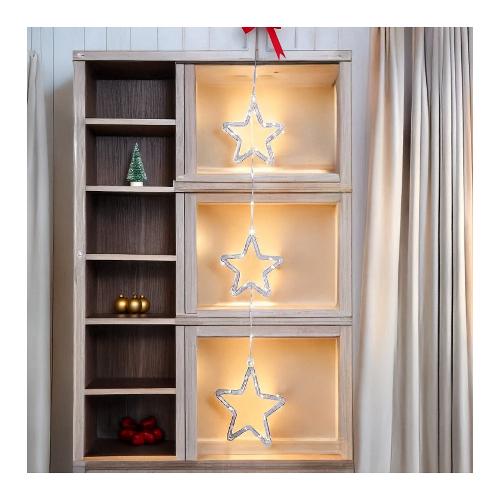 Decorazione Natalizia 3 Stelle da appendere H60cm PGS in plastica Crystal illuminata da 50 MicroLED BIANCO CALDO a Luce Fissa, 2 stelle ø11,5cm e 1 stella ø14cm, Timer Giornaliero 8 ore On (16 ore Off), porta batterie IP44 con pulsante 3 funzioni Timer - On - Off, a Batteria 2xAA 1,5V, IP20 uso Interno e Portatile, Cavo Alimentazione Trasparente 30cm con Gancio regolabile per appendere incluso