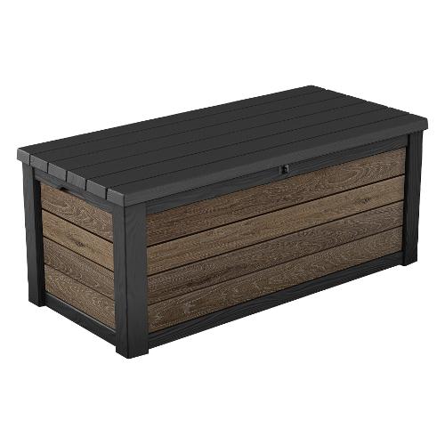 Baule con particolare finitura effetto legno super realistica, alla vista e al tatto. Dotato di pistoni per un’apertura e una chiusura facilitate. Sistema di chiusura con lucchetto (lucchetto non incluso). Seduta per due persone adulte. Resistente ai raggi UV e alle intemperie