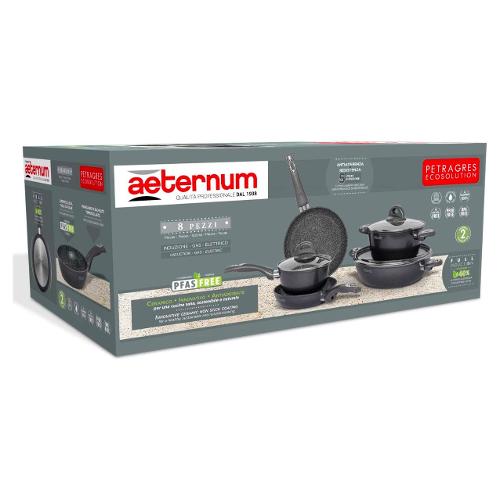 Batteria pentole con rivoluzionario rivestimento antiaderente ceramico petragres che permette di risparmiare tempo ed energia (fino al 40% *rispetto all’induzione standard e ai rivestimenti in ptfe)