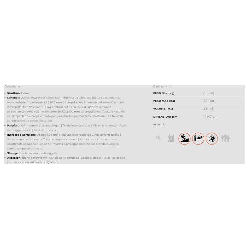 Ingresso 2 porte di cui una in zanzariera. Cuffie di ventilazione. Sistema areazione camera “air” con ampia zanzariera . Falda a terra, che garantisce un'ottimale aerazione quando è arrotolata e protegge l'interno della tenda in caso di cattivo tempo, se srotolata
