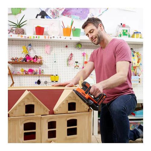 Il design leggero, compatto ed ergonomico consente di levigare gli spazi più intricati e irregolari con controllo e comfort completi. Parte del sistema agli ioni di litio da 18 v, questa levigatrice viene fornita senza batteria, rendendola la scelta ideale se possiedi già uno strumento black+decker agli ioni di litio da 18 v con batteria. Puoi ampliare la tua collezione senza accumulare batterie e caricabatterie che non ti servono.