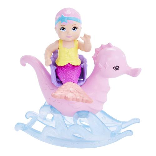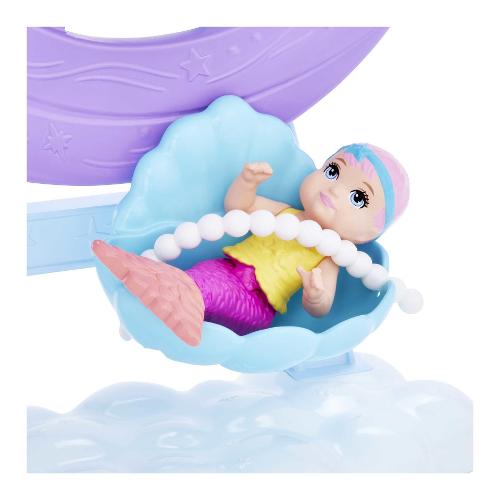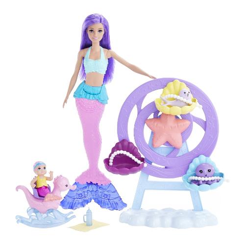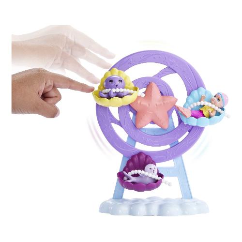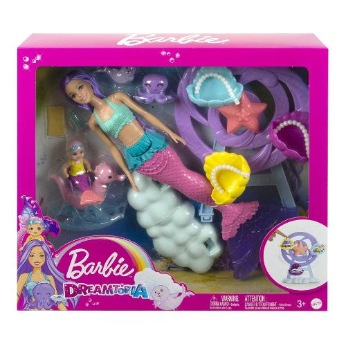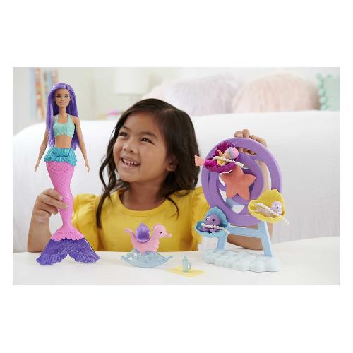 Aiuta barbie® a prendersi cura della baby sirena, foca e polpo con questo set fantasia che aggiunge un tocco di magia e permette a bambini e bambine di mostrare il loro lato affettuoso. La sirena ha capelli fantasia color lavanda e una coda rosa pastello ricca di dettagli con pinne viola. Indossa un corpetto giallo brillante e una balza con volant sui fianchi! Il letto marino a forma di ruota panoramica ha tre culle a conchiglia e gira davvero! Posiziona i cuccioli all'interno e proteggili con una cinghietta di perle per assicurarti che siano sempre protetti. Fai sedere la baby sirena sull'adorabile dondolino a forma di cavalluccio marino per un divertimento abissale! Il dolce dondolio riproduce il movimento delle correnti oceaniche, un effetto super rilassante per una baby sirena. Il biberon e la copertina inclusi incoraggiano il gioco di ruolo. Fascia la foca, gioca a cucù con il polpo o dai da mangiare alla baby sirena: le possibilità di narrazione sono infinite!