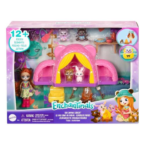 Unisciti agli enchantimals e ai loro amici cuccioli per trascorrere il weekend in campeggio con il playset tenda da campeggio delle coccole! Il playset include una bambola da circa 10 cm con gonna e cappello rimovibili, un cucciolo e 3 piccoli amici cuccioli. Il set include anche tutti gli accessori necessari per inventare divertenti storie da campeggio: più di 12 pezzi in totale, tra cui una tenda con aree separate per la bambola e il cucciolo, una chitarra, un falò e marshmallow sui bastoncini.