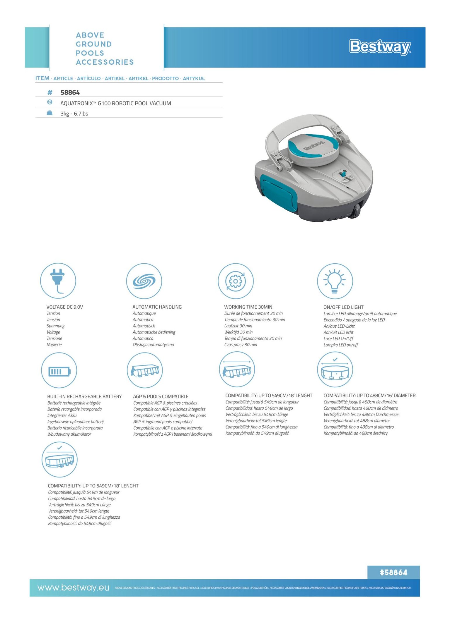 Scopri la tecnologia avanzata di bestway® aquatronix™ g100, un robot per piscina autonomo, alimentato a batteria, che pulisce a fondo il fondo della piscina e senza fastidiosi cavi. Non importa se la tua piscina è rotonda, quadrata o ovale: questo aiutante intelligente gestisce senza sforzo superfici fino a 18 m². Aquatronix™ g100 si ricarica in sole 2,5-4,5 ore e garantisce 30 minuti di pulizia senza pensieri. In questo modo potrai rilassarti di più e preoccuparti meno della manutenzione della piscina. Grazie all'ingegnoso sistema di guida degli ugelli, il robot da piscina riesce a superare abilmente gli ostacoli. I sensori dell'acqua integrati consentono l'accensione e lo spegnimento automatici per preservare la durata della batteria e massimizzare l'efficienza. Dotato di chiusure a clip, di un pratico dispositivo di recupero e di un cestello filtrante facile da pulire (1,5 litri), aquatronix™ g100 offre totale libertà di movimento grazie al suo design senza fili. Le maniglie per il trasporto assicurano una facile movimentazione. Grazie al cavo di ricarica usb in dotazione, il robot è di nuovo pronto all'uso in pochissimo tempo. Bestway® aquatronix™ g100 è la scelta perfetta per chi desidera mantenere la propria piscina pulita e invitante senza troppa fatica. Godetevi il lusso di una piscina costantemente immacolata, con il minimo sforzo grazie all'innovativa tecnologia bestway®