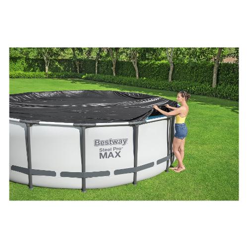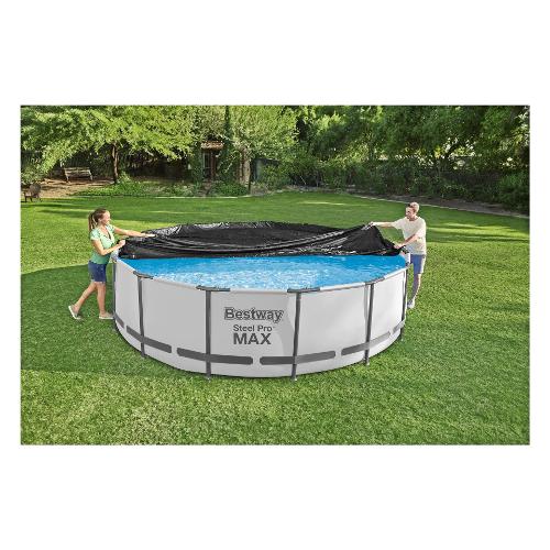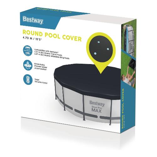 Immergiti nella massima protezione per la tua piscina con la nostra copertura, perfetta per piscine fino a 180" di diametro, comprese le piscine steel pro max™ e fast set™. La nostra copertura per piscina è realizzata in resistente pvc ed è appositamente progettata per proteggere la piscina dagli agenti atmosferici e tenere lontani gli agenti contaminanti. Grazie alle corde di fissaggio integrate, puoi fissare il telo alla tua piscina in modo semplice e sicuro, senza doverti preoccupare di eventuali raffiche di vento impreviste. I fori di drenaggio impediscono all'acqua di accumularsi sul telone.