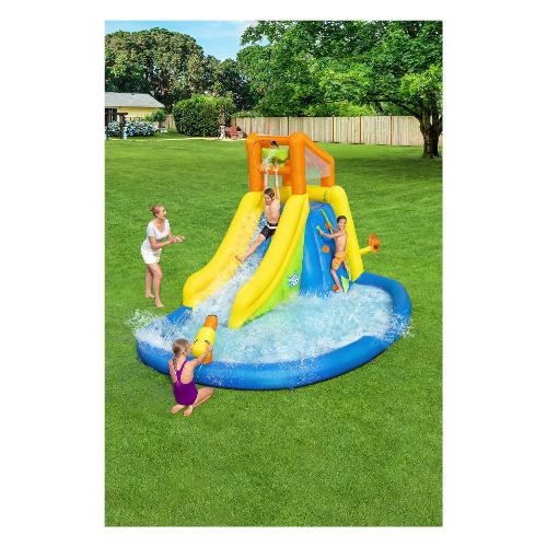 Andiamo in gita al monte splashmore, dove le onde sono alte e i cuori sono ancora più veloci! Questo mega parco acquatico di h2ogo!® Offre più attrazioni di quante se ne possano contare sulle dita di una mano. Grazie alla parete da arrampicata con appigli, fune e scivolo gigante, i bambini si divertono tantissimo all'aria aperta, al sole. In cima alla torre, l'acqua fuoriesce all'improvviso e bagna i bambini mentre scivolano giù. Grazie al cannone ad acqua sottostante, i bambini possono spruzzare acqua sullo scivolo e sui loro amici. La piscina extra large è il luogo ideale per sguazzare e rilassarsi. E la parte migliore è che... il ventilatore incluso pompa l'intero sistema in meno di due minuti! La prossima meta per le vacanze: il monte splashmore! Ideale per max 5 bambini (peso max idividuale 54 kg)