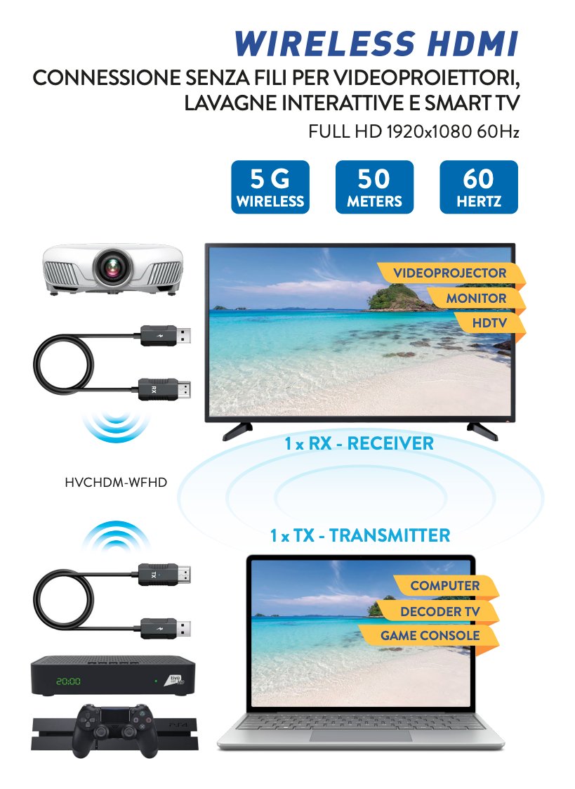 Wireless HDMI è un kit esterno composto da trasmettitore e ricevitore wireless che permette di trasmettere video e audio dal computer o altre sorgenti HDMI a monitor o TV grande schermo senza l'ingombro dei cavi.
