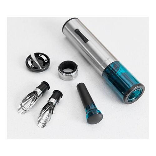 la confezione comprende: Cavatappi + 5 accessori (2 versatori di vino anti-goccia, tappo con chiusura ermetica e un taglia etichette.)