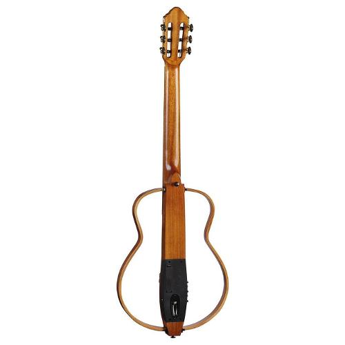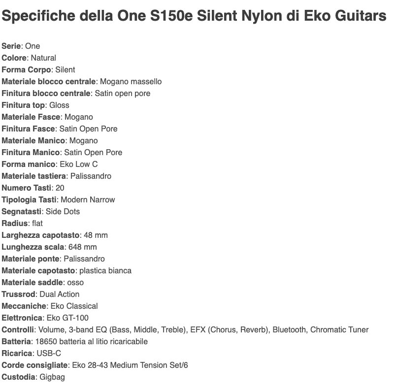 La One S150e Silent Nylon è la chitarra classica elettrificata con struttura silent (senza cassa) della serie "One" di Eko Guitars. È realizzata in finitura satin open pore con blocco centrale in Mogano, fasce rimovibili in Mogano, manico in Mogano e tastiera 20 tasti in Palissandro. È amplificata con sistema Eko GT-100 che fornisce controlli di volume, eq a tre bande, accordatore cromatico, effetti di Chorus e Reverb, ingresso Bluetooth, ingresso aux e uscita cuffie oltre quella per strumento. Fornita di una comoda gigbag per il trasporto.