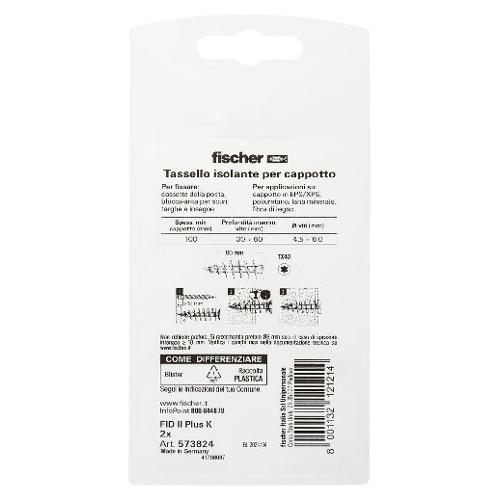 Il tassello isolante fischer fid ii plus è adatto per il fissaggio di oggetti di peso medio su cappotto termico. Grazie alla funzione combinata di centratura, fresatura e taglio della punta autoforante, fid ii plus può essere avvitato con precisione millimetrica e senza danneggiare l'isolamento. L'uso opzionale di un componente chimico aggiuntivo come fischer fill&fix, aumenta significativamente i valori di carico. Ciò consente di fissare in modo sicuro elementi come colonnine di ricarica auto, cassette portalettere, blocca-anta laterali per scuri e piccole insegne.