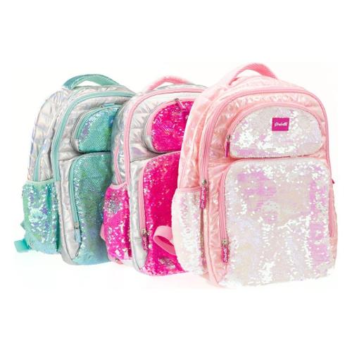Le tasche esterne sono rivestite di scintillanti paillettes reversibili girabrilla: le due frontali sono richiudibili con zip e le laterali, grazie al bordo elastico sono alloggiamenti perfetti per borracce e piccoli oggetti.