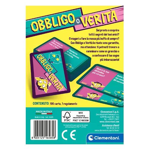 Il popolare gioco di sfide in una veste tutta nuova. Un gioco per divertirsi con gli amici, con obblighi divertenti o imbarazzanti verità. Un gioco adatto a tutta la famiglia. Il pratico formato permette di portare il gioco ovunque. Made in Italy