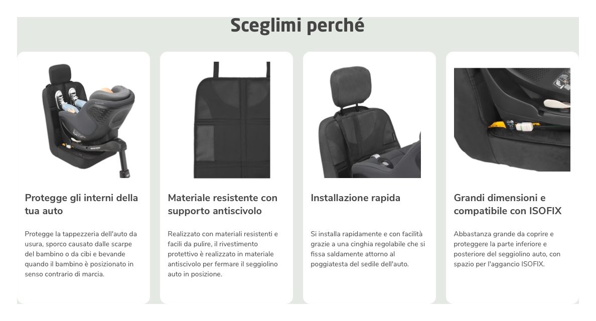 Non preoccuparti, gli interni dell'auto sono al sicuro e protetti da un apposito rivestimento maxi-cosi, che copre completamente il sedile posteriore dove è installato il seggiolino auto. Puoi sistemarlo facilmente sotto tutti i nostri seggiolini auto e in tutti i tipi di veicoli, lasciando comunque spazio per accedere ai connettori isofix. Non dovrai più preoccuparti di macchie o danni al sedile posteriore del tuo veicolo.
