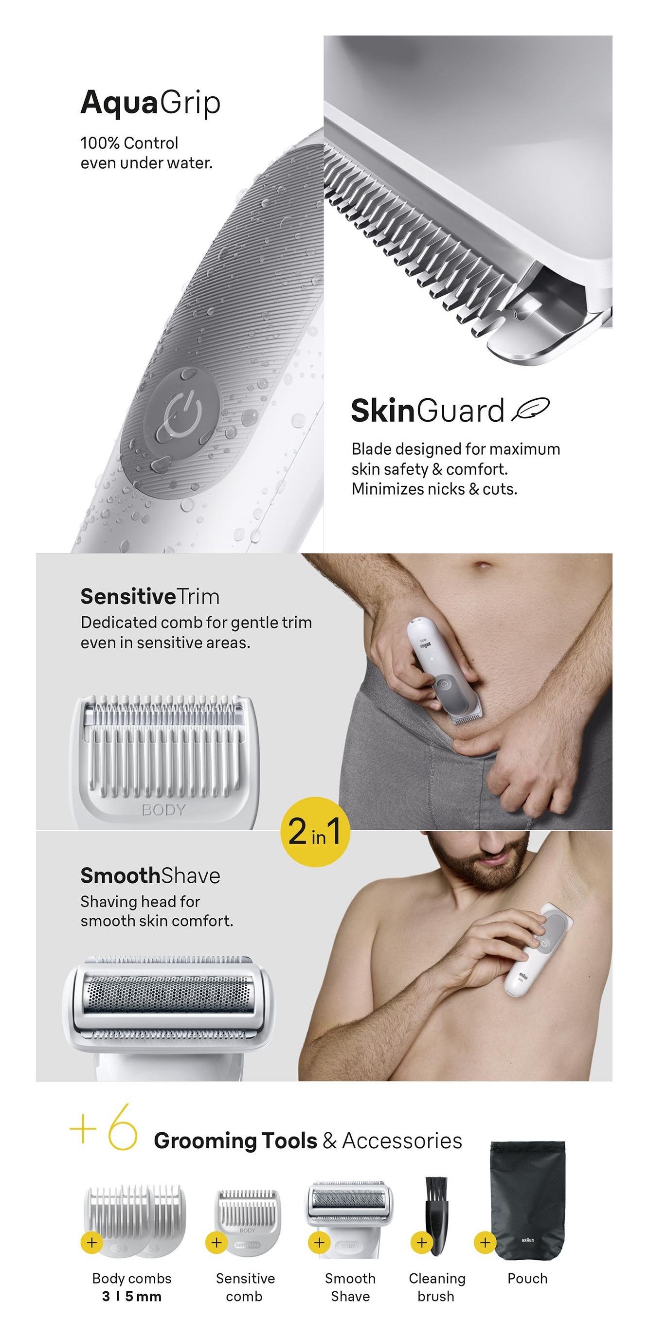 Il rasoio elettrico corpo uomo di Braun è progettato per una rasatura delicata e protegge la pelle sensibile del corpo. Questo rasoio corpo uomo riduce al minimo tagli e graffi grazie alla tecnologia SkinGuard, permettendoti di radere e rifinire ovunque, anche sotto la doccia con l'impugnatura AquaGrip. Il pettine Sensibile garantisce una rasatura sicura e confortevole prevenendo il contatto diretto con la lama.