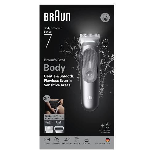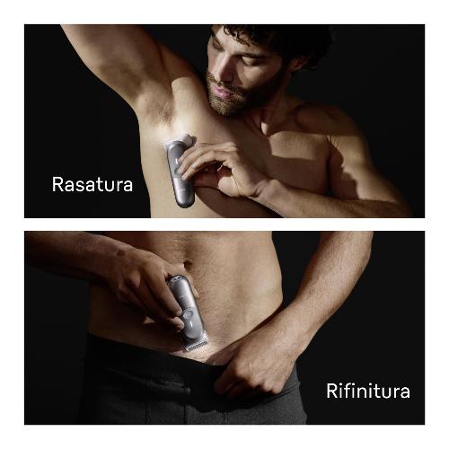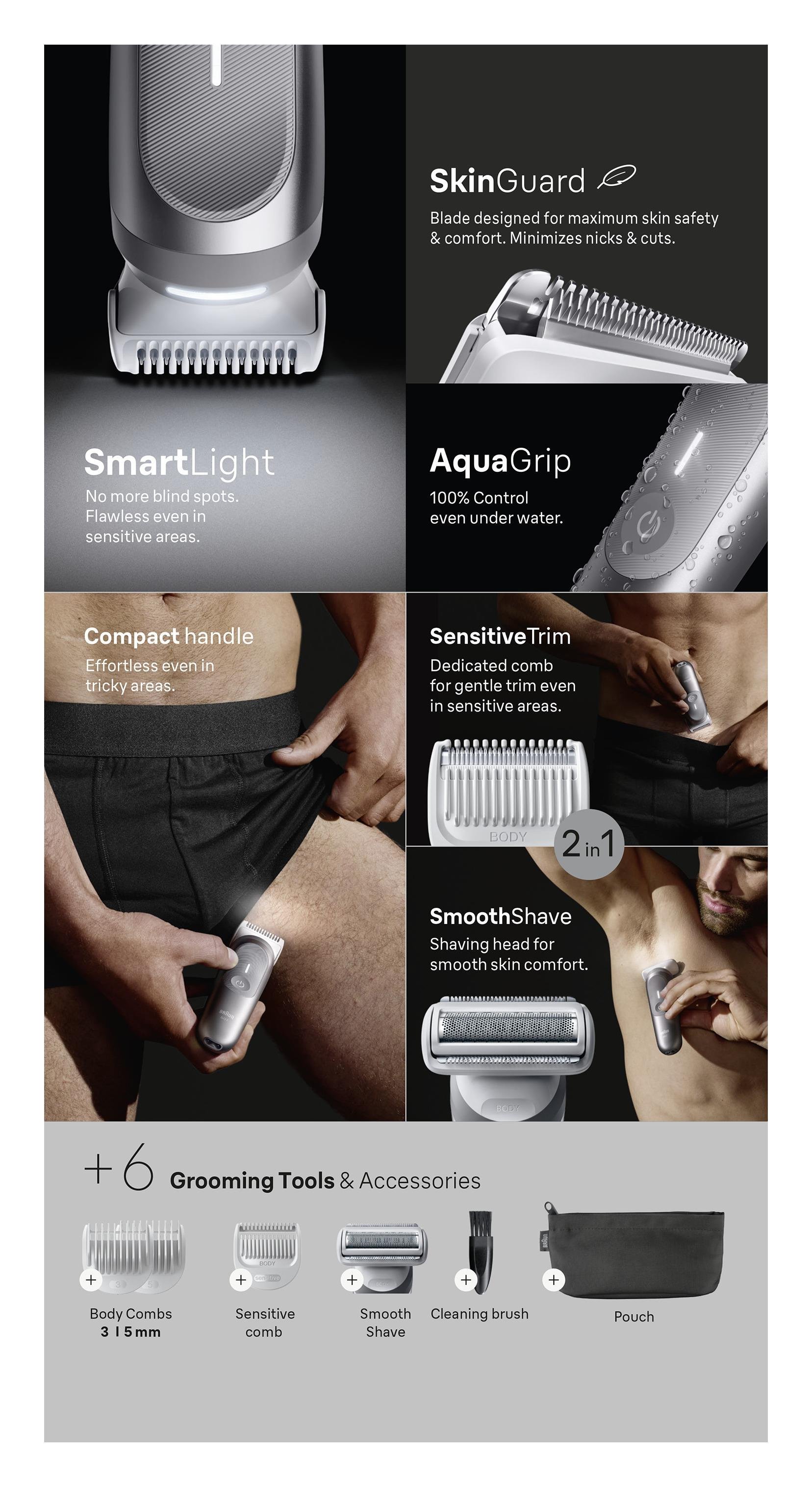 Il miglior rasoio elettrico corpo uomo di Braun è delicato per il massimo comfort sulla pelle. La luce SmartLight aiuta a rivelare anche i peli più sottili, per una depilazione maschile accurata e anche della zona intima. La tecnologia SkinGuard minimizza tagli e graffi. Utilizza la testina SmoothShave per radere i peli del corpo in tutta sicurezza, o regolali con l'accessorio SensitiveTrim. Dotato di impugnatura AquaGrip per un facile utilizzo sotto la doccia. Il pettine Sensitive previene il contatto della pelle con la lama.