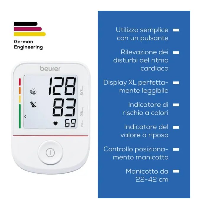 Il misuratore di pressione BM 38 ti conquisterà con il suo utilizzo semplice grazie a un solo pulsante. La misurazione della pressione sanguigna può essere avviata con un solo tocco, risultando così particolarmente intuitiva. Ideale per l'uso quotidiano, senza impostazioni complicate. Incluso manicotto per circonferenze braccio di 22 - 42 cm