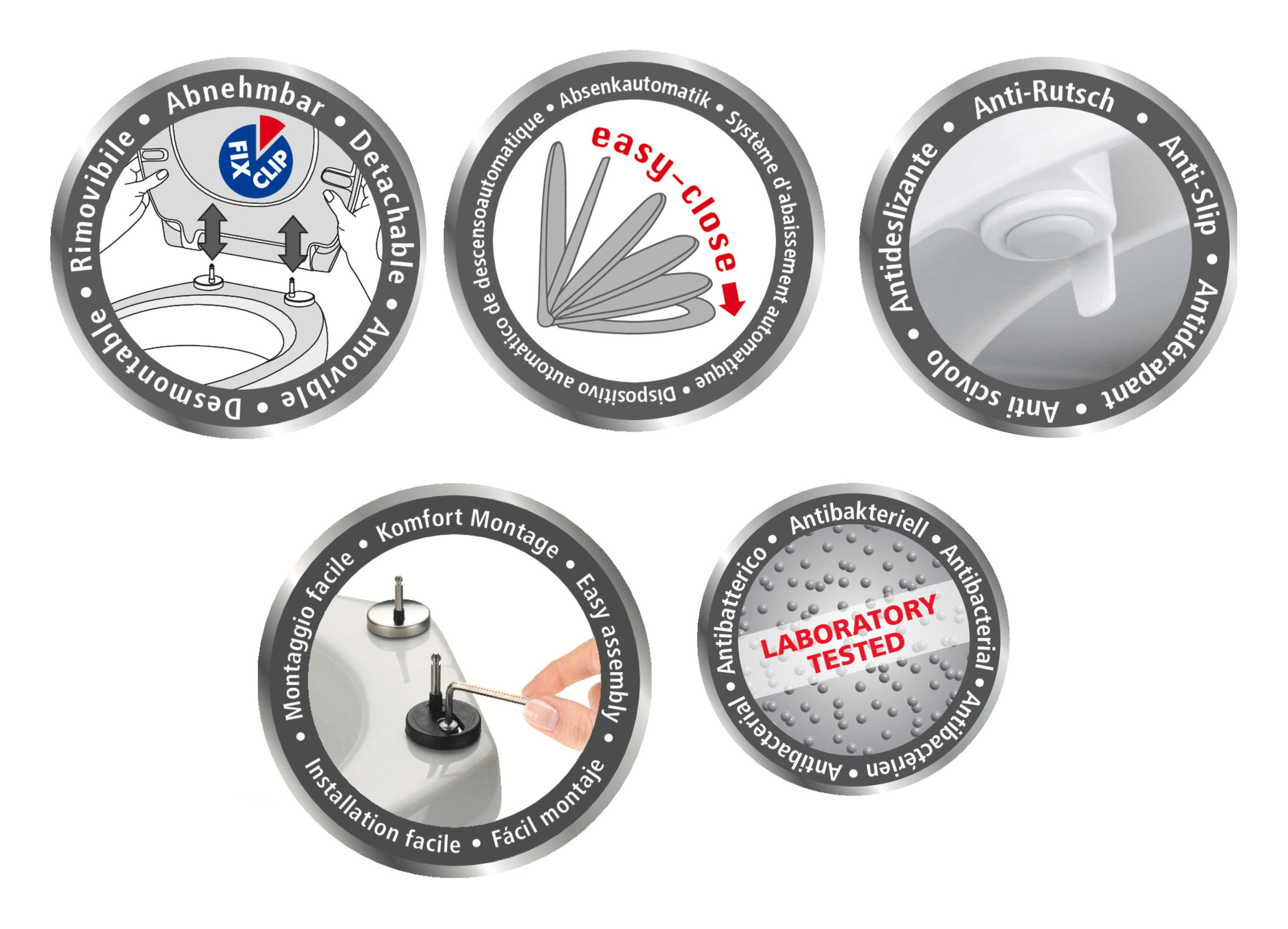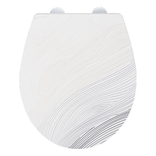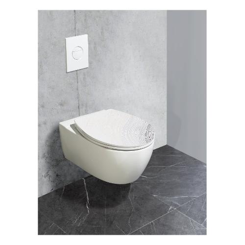 Sedile wc superficie con decoro in rilievo. Massima igiene grazie alle cerniere in acciaio inox con rilascio ad un pulsante fix-clip. Un inserto gommato che viene montato insieme al fissaggio fix-clip sulla tazza del water evita che il sedile scivoli avanti ed indietro. Chiusura ammortizzata automatica integrata easy-close. Incluso paracolpi.
