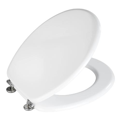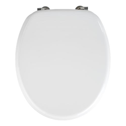 Sedile wc con cerniere in acciaio inox. Verniciatura multistrato resistente all‘umidità. Incluso paracolpi.