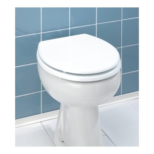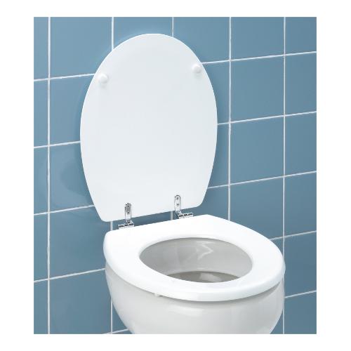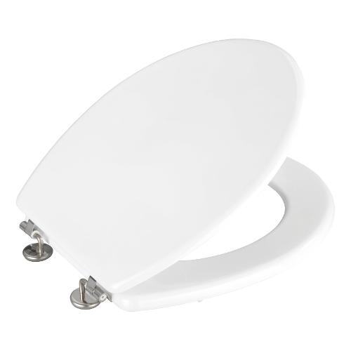 Sedile wc con cerniere in acciaio inox. Verniciatura multistrato resistente all‘umidità. Incluso paracolpi.