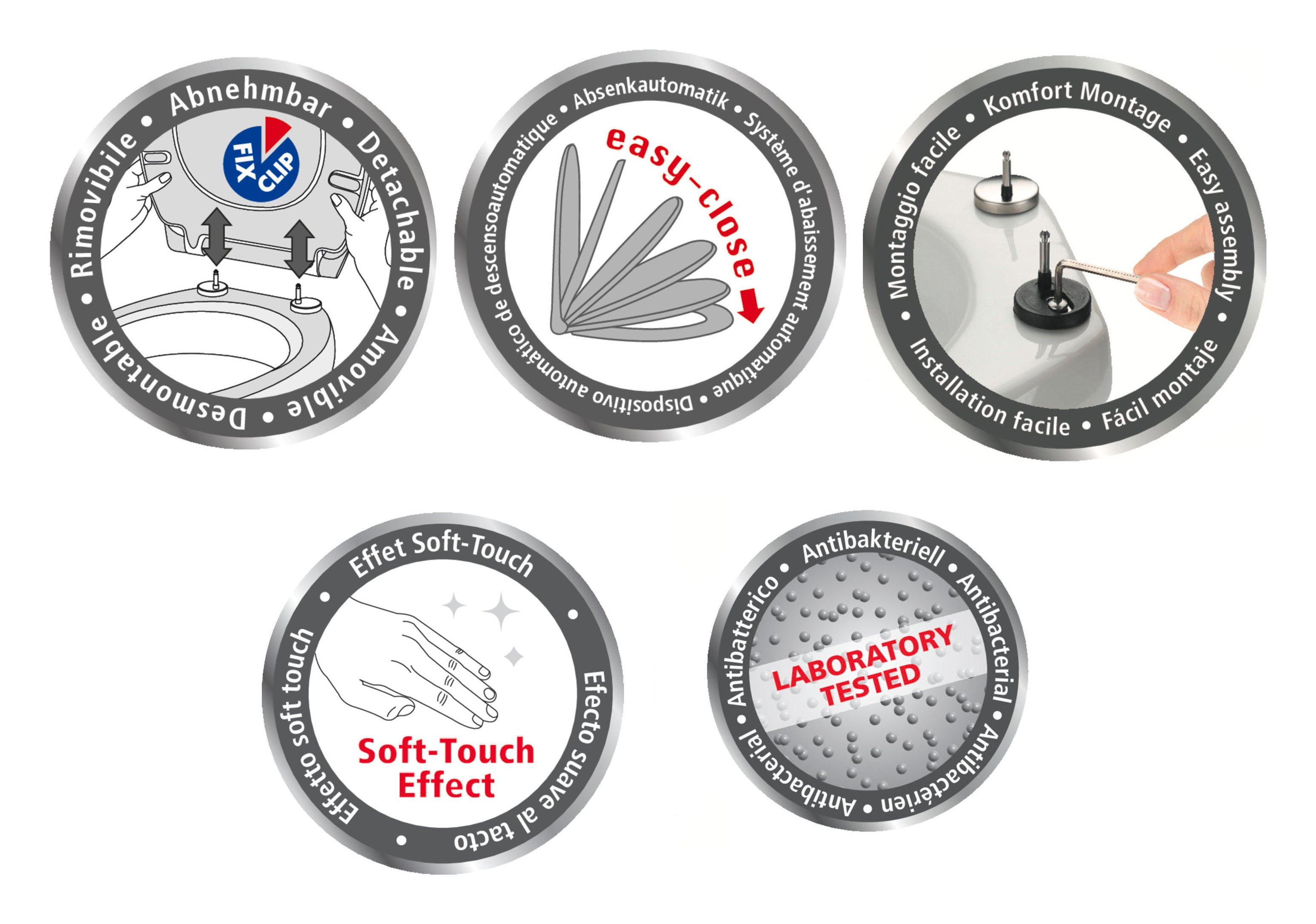 Sedile wc finitura soft touch con trattamento anti ditate. Cerniere in acciaio inox con un pulsante fix-clip per facilitare la pulizia e chiusura ammortizzata automatica integrata easy-close. Inserto gommato antiscivolo che evita ogni movimento del sedile sulla tazza del wc. Incluso paracolpi.