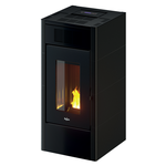 Stufa a pellet canalizzabile con possibilità di riscaldare l’ambiente in cui è installata ed altri adiacenti. Rivestimento in acciaio verniciato.