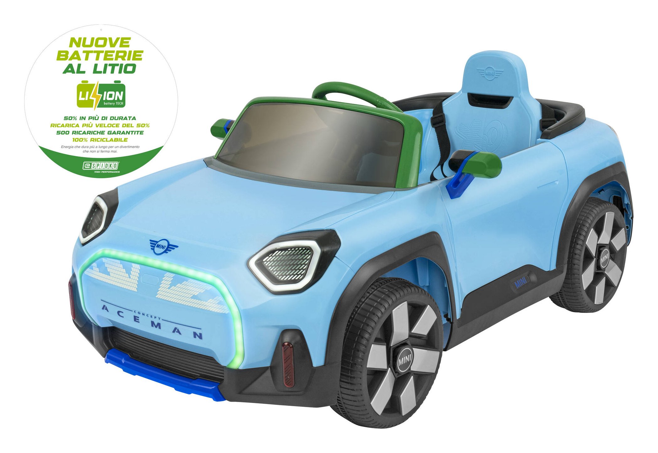 Inoltre, la cintura di sicurezza e le sospensioni posteriori garantiscono massimo comfort e protezione. L’esperienza di guida è ancora più emozionante grazie alla connessione bluetooth, mp3 e usb, così il tuo piccolo pilota potrà ascoltare la sua musica preferita mentre sfreccia nel vialetto! Mini aceman è dotata di indicatore di stato batteria, clacson funzionante e luci led anteriori e posteriori, per un’esperienza di guida completa, proprio come una vera auto! Ideale per bambini dai 3 anni in su, con una capacità di carico fino a 30 kg.