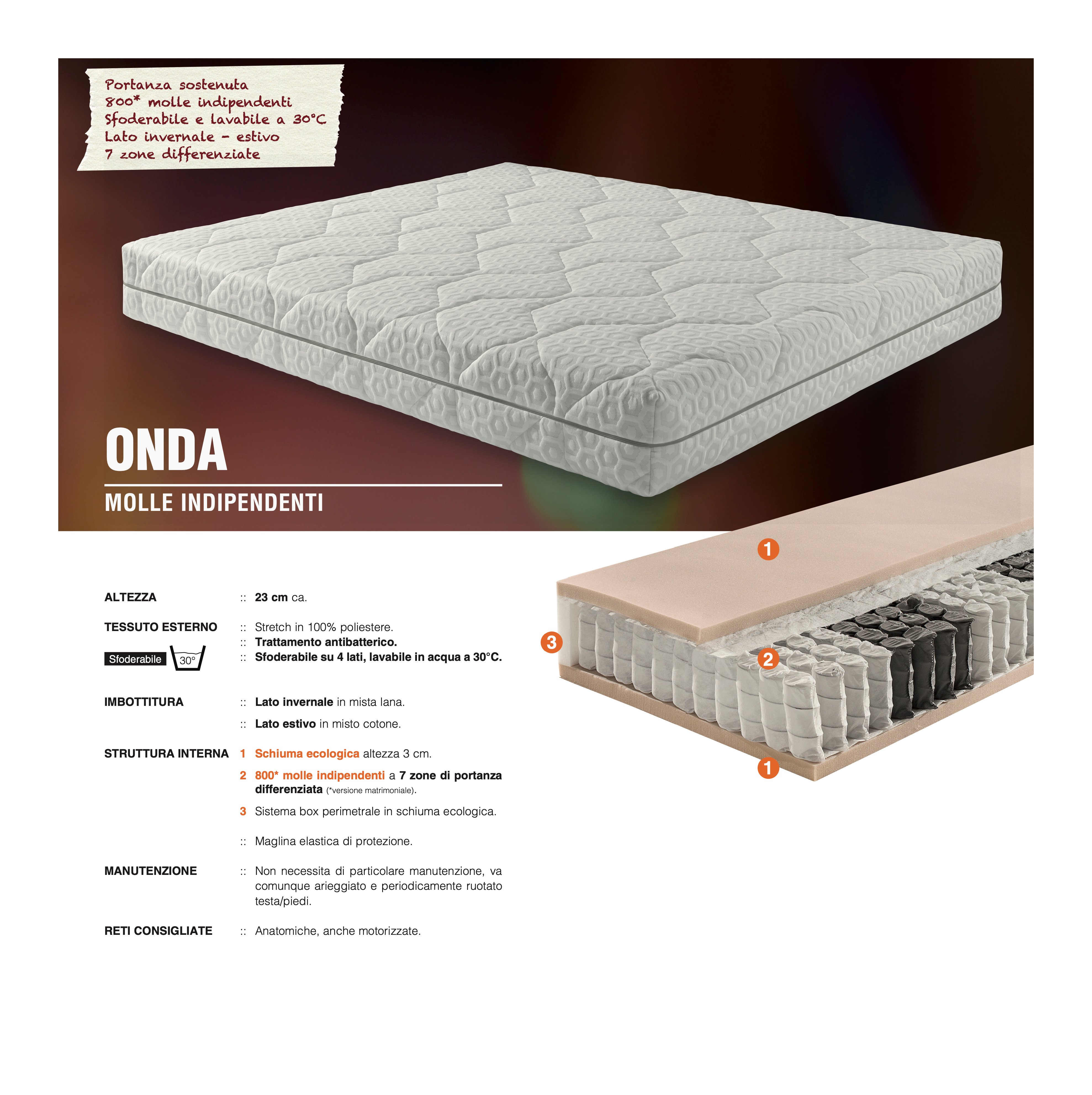 Portanza sostenuta. Molle indipendenti. Sfoderabile e lavabile a 30°C. Lato invernale e estivo. 7 zone differenziate