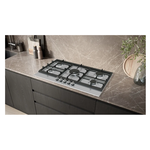 Piano cottura a gas in acciaio inossidabile con tecnologia stepFlame per un controllo preciso della fiamma, manopole magnetiche removibili e griglie continue per una facile pulizia.