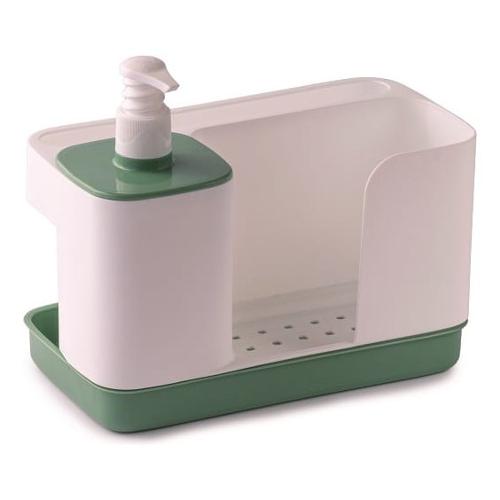 In un unico prodotto: dispenser per sapone liquido o detersivo per i piatti, vano per spugne e guanti, supporto per panni e strofinacci.