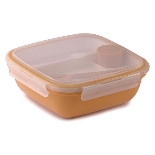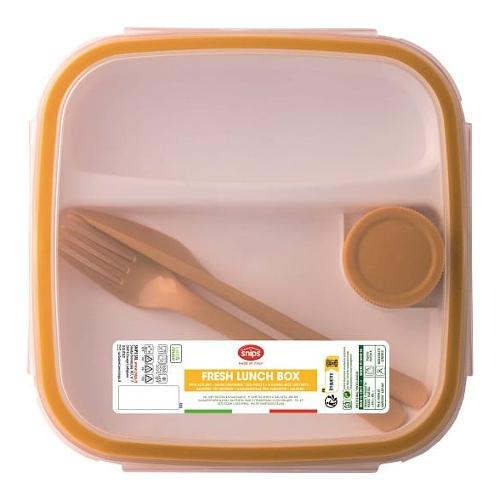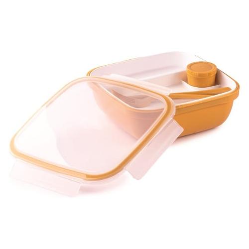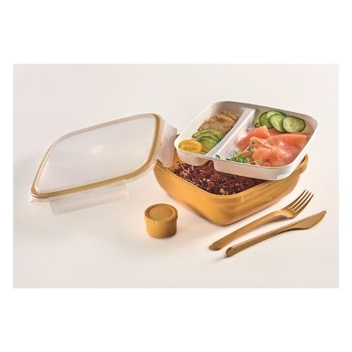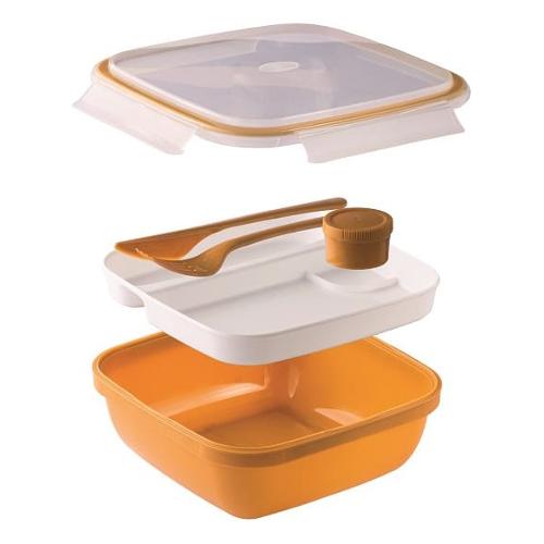 Il set è composto da contenitore principale, vassoio estraibile con vano posate e coperchio con guarnizione ermetica. Le posate e la salsiera completano il set.
