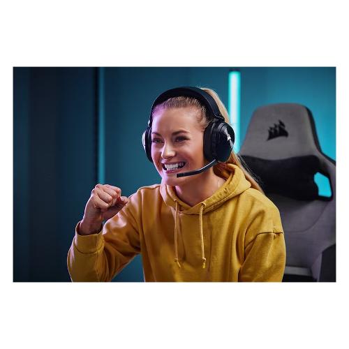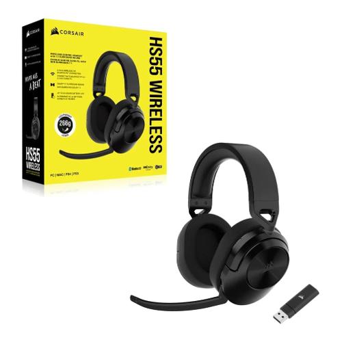 La cuffia gaming con microfono CORSAIR HS55 WIRELESS combina un sistema audio wireless con connessione da 2,4 GHz a bassa latenza, Bluetooth e Audio Dolby Surround 7.1 su PC e Mac con un telaio leggero, che offre un comfort essenziale per l’utilizzo quotidiano.
