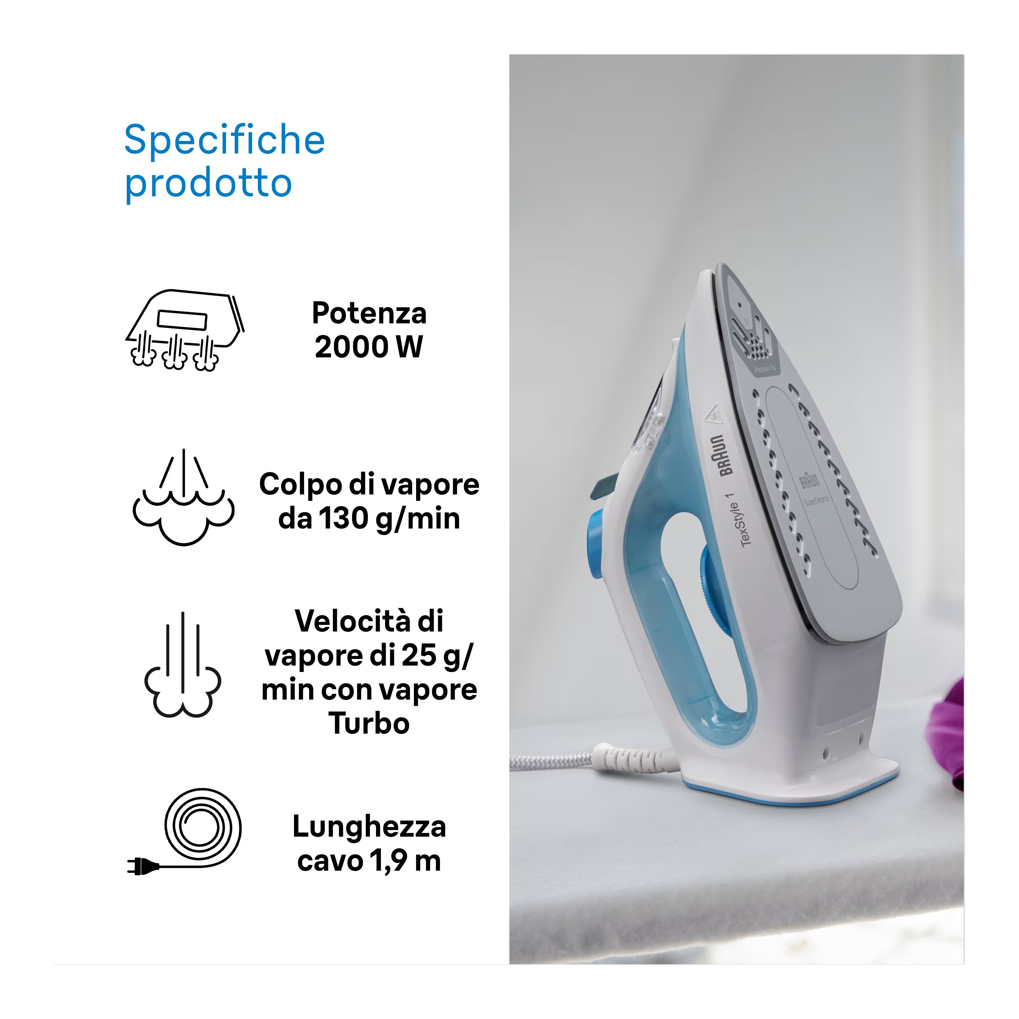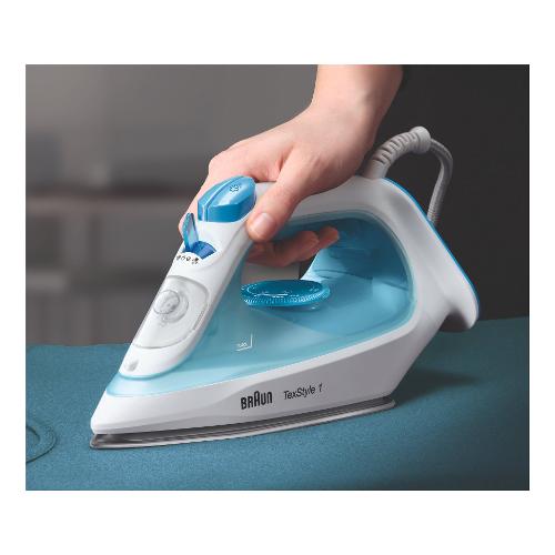 Il ferro da stiro a vapore TexStyle1 è il ferro a vapore più leggero della gamma Braun.