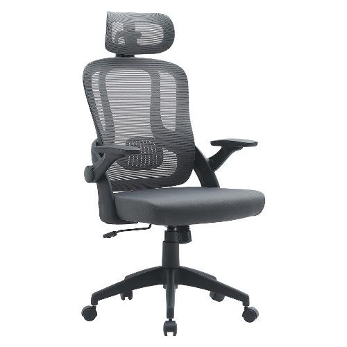 Base in nylon Ø 68 cm. Ruote in nylon. Seduta in compensato, imbottita in schiuma poliuretanica (densità 25kg/m3) e rivestita in tessuto Poliestere 100%. Schienale e poggiatesta in plastica (pp) rivestito in tessuto a rete Poliestere 100% con supporto lombare. Braccioli in plastica (pp). Regolazione dell'altezza con pistone a gas