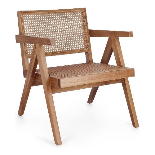 Legno teak, finitura naturale con vernice a base di nitrocellulosa. Schienale con intreccio in Rattan. Solo per uso interno