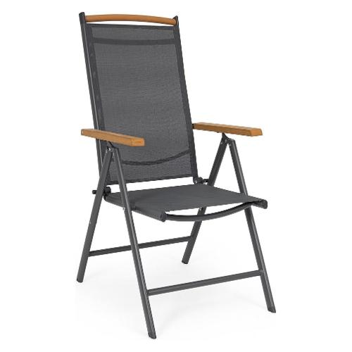 Struttura in alluminio verniciata a polvere (Poliestere). Braccioli e barra schienale con inserti in Polywood (materiale composito dall'aspetto simile al legno). Seduta e schienale in Textilene 2x1. Reclinabile in 7 posizioni