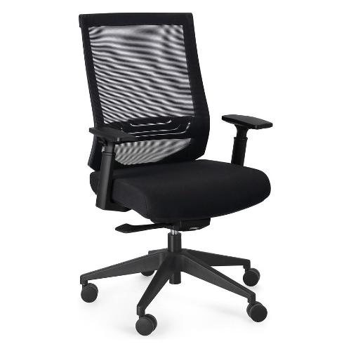 Base in nylon Ø 71 cm. Ruote in nylon. Seduta con imbottitura in schiuma poliuretanica densità 60kg/m3 e rivestimento in tessuto a rete Poliestere 100%. Schienale in plastica (pp) con supporto lombare con rivestimento in tessuto a rete Poliestere 100%. Dotata di meccanismo synchro che permette il movimento sincronizzato tra sedile e schienale e il blocco dello schienale nella posizione desiderata (3 posizioni). Altezza seduta e braccioli regolabile