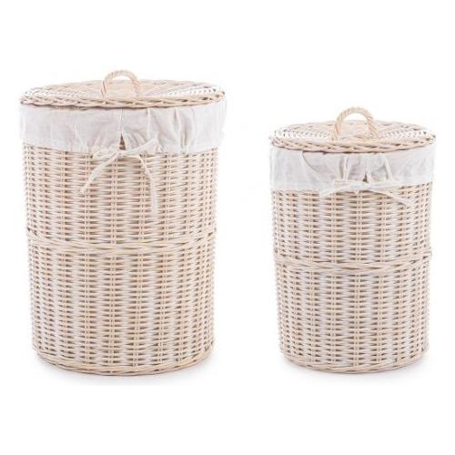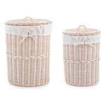 Rattan bianco decapato. Tessuto interno in cotone. Ø40x54h; ø50x64h