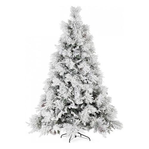 Albero innevato. Struttura dei rami e base in metallo. Materiale degli aghi pe stampato ad iniezione e pvc decorati con pigne. Rami effetto spazzola che riproducono la struttura degli aghi di pino. Apertura facilitata ad ombrello. Cartone effetto legno con etichetta colorata