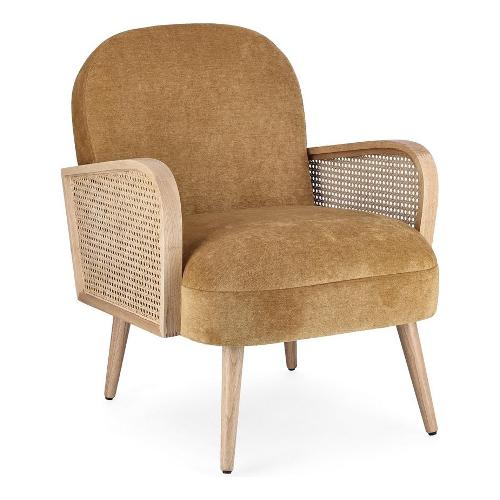 Struttura in legno di pino e compensato. Gambe in Rubberwood. Braccioli con inserti in Rattan. Rivestimento in Poliestere. Densità imbottitura in schiuma poliuretanica 24 kg/m3. Non sfoderabile