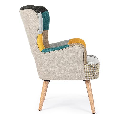 Struttura in Rubberwood e compensato, verniciatura a base di nitrocellulosa. Rivestimento in Poliestere con lavorazione patchwork. Densità imbottitura seduta 36kg/m3