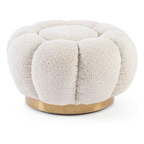 Struttura in compensato. Rivestimento in Poliestere effetto bouclé. Imbottitura in schiuma poliuretanica (densità 25kg/m3). Fondo con anello decorativo in acciaio verniciato color oro