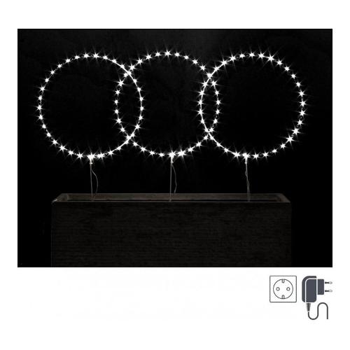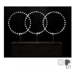 Decorazione luminosa composta da 3 cerchi, struttura in colore bianco, diametro 35cm. 105microled in totale.35 microled a cerchio. Luce fredda. Lunghezza cavo di alimentazione 3m, distanza led 3,3cm. Dotato di presa schuko. Solo per uso interno. Ip20. Con trasformatore 4.5v/1.35w